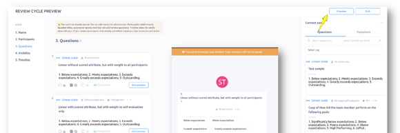 The review building process now includes a Preview feature on the "Questions" page, allowing users to see their review questions in the final format before saving and moving to the next step. The preview replicates the user review response layout, displays all questions (regardless of targeted participants), and shows additional details on linear questions, such as score and weight. An "Export Review" option is also available within the preview, letting users export review questions in PDF, CSV, or Excel formats via a simple pop-up or drop-down menu.